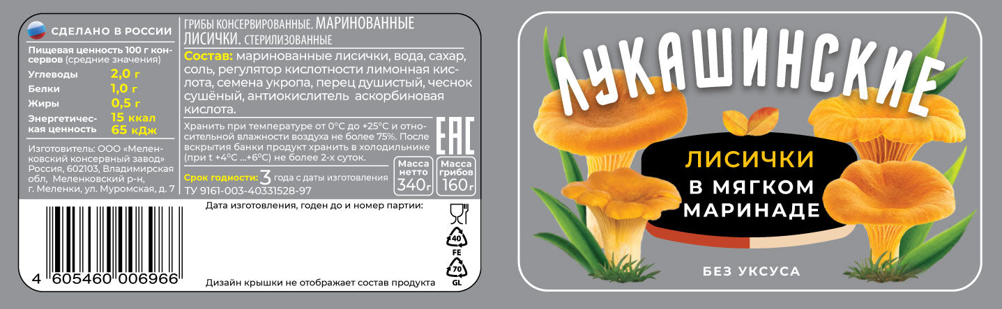 アンズタケ、水、砂糖、食塩、ディルシード、オールスパイス、にんにく/酸味料(クエン酸)、酸化防止剤(V.C)Состав: маринованные лисички, вода, сахар, соль, регулятор кислотности лимонная кислота, специи, антиокислитель аскорбиновая кислота.