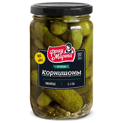 Маринованные корнишоны от «Фрау Марты» любимы хозяйками за гармоничный вкус и аккуратный размер огурчиков 3-7 см.