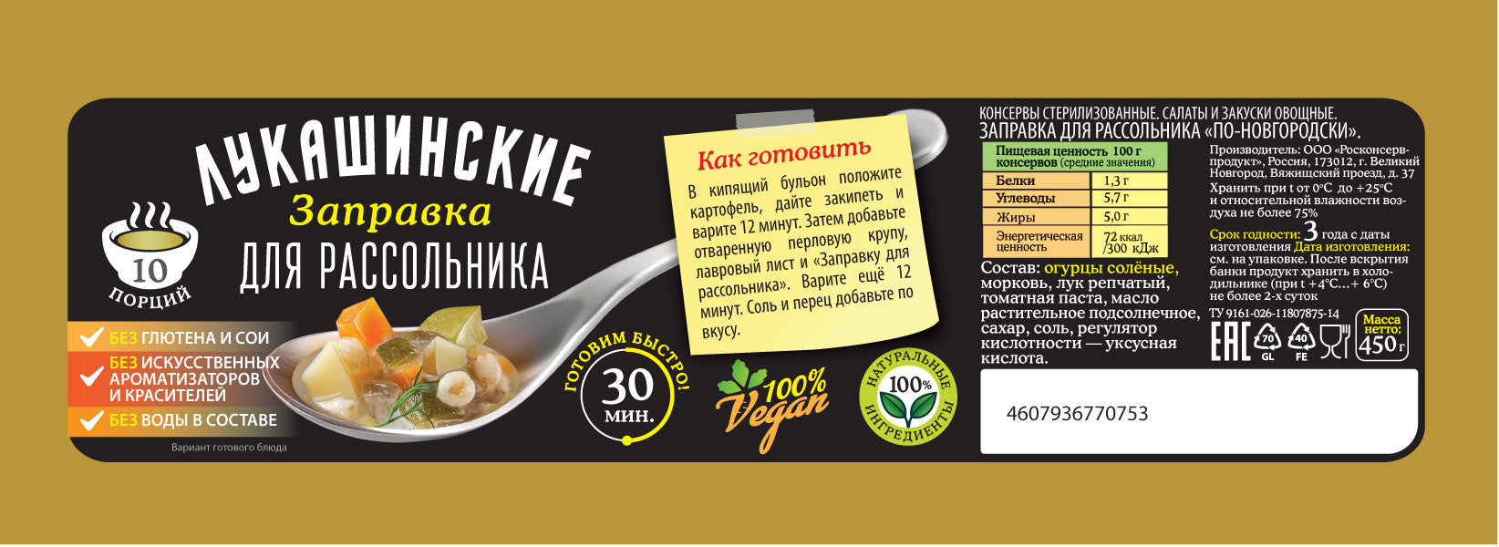 Заправка для приготовления рассольника . Классика Русской кухни. Наша заправка не только сэкономит Вам время но и подарит рецепт вкусного блюда.Продукт , от "Лукашинских" заправка для рассольника - высокого качества . Рецепт приготовления блюда - на банке.
